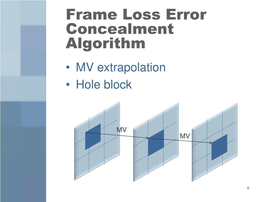 Frame Loss Error Concealment Algorithm • MV extrapolation • Hole block MV MV