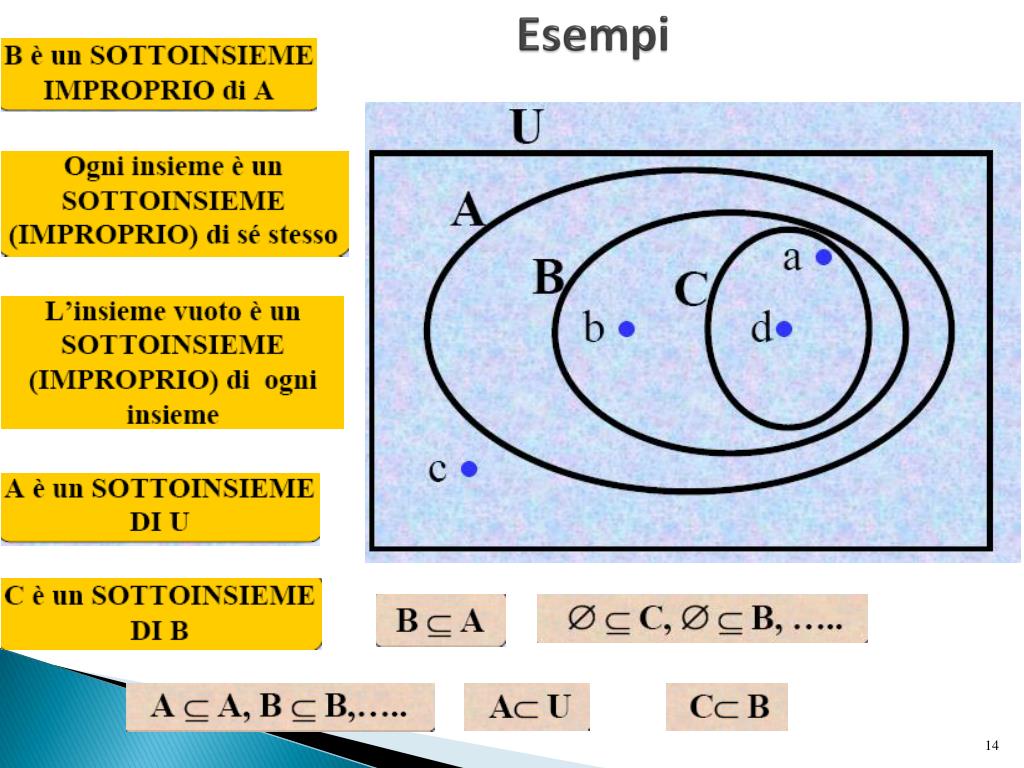 Un insieme può essere contenuto in un altro A B 0 4 1 2 3 Si dice allora che B è un sottoinsieme di A: B A
