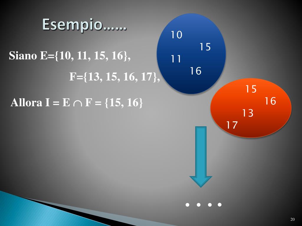 Esempio…… 10 15 11 16 Siano E={10, 11, 15, 16}, F={13, 15, 16, 17}, 15 16 13 17 Allora I = E F = {15, 16} ….