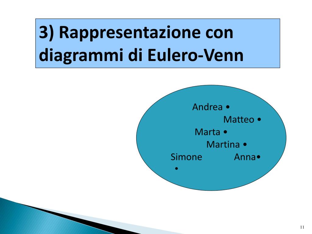 3) Rappresentazione con diagrammi di Eulero-Venn Andrea • Matteo • Marta • Martina • Simone Anna•