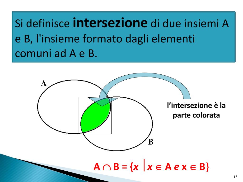 A B Si definisce intersezione di due insiemi A e B, l'insieme formato dagli elementi comuni ad A e B. l’intersezione è la parte colorata A B = {x x A e x B}