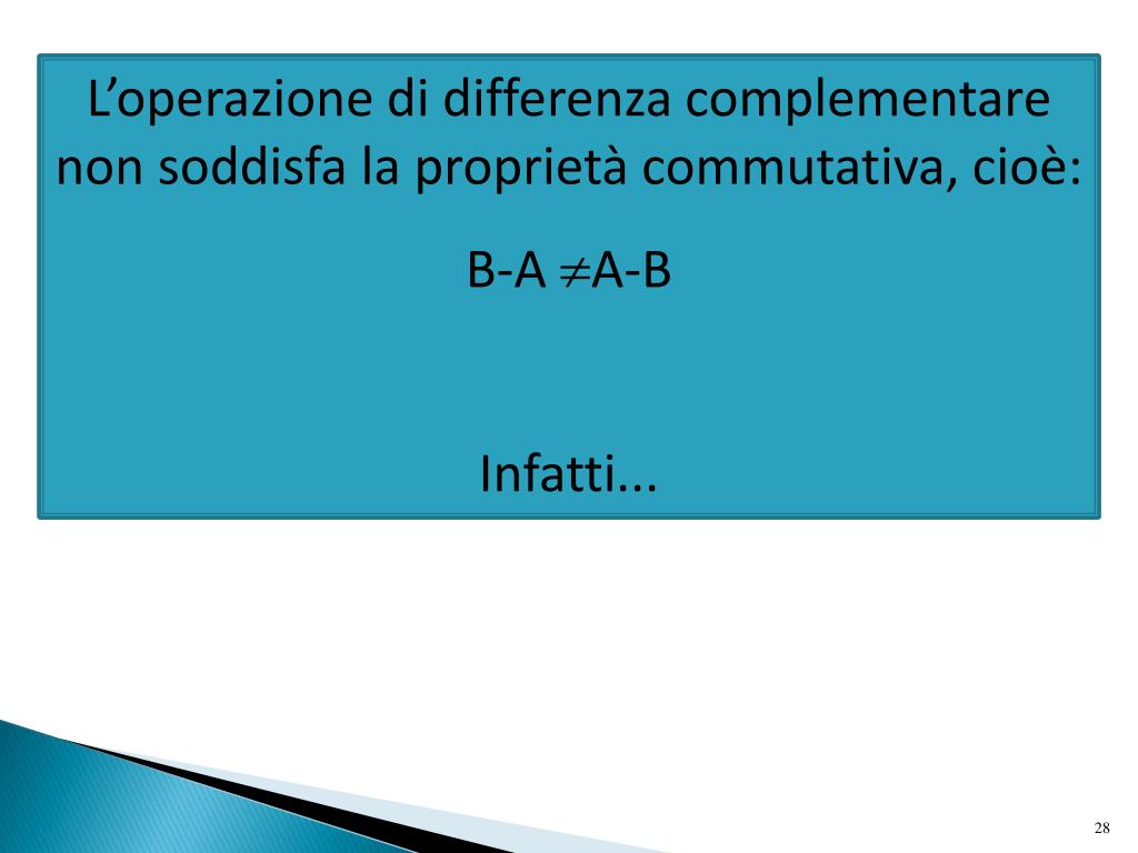 L’operazione di differenza complementare non soddisfa la proprietà commutativa, cioè: B-A A-B Infatti...