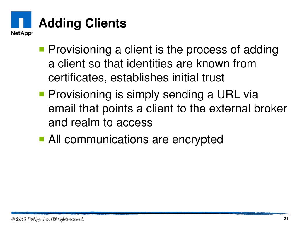 Adding Clients • Provisioning a client is the process of adding a client so that identities are known from certificates, establishes initial trust • Provisioning is simply sending a URL via email that points a client to the external broker and realm to access • All communications are encrypted