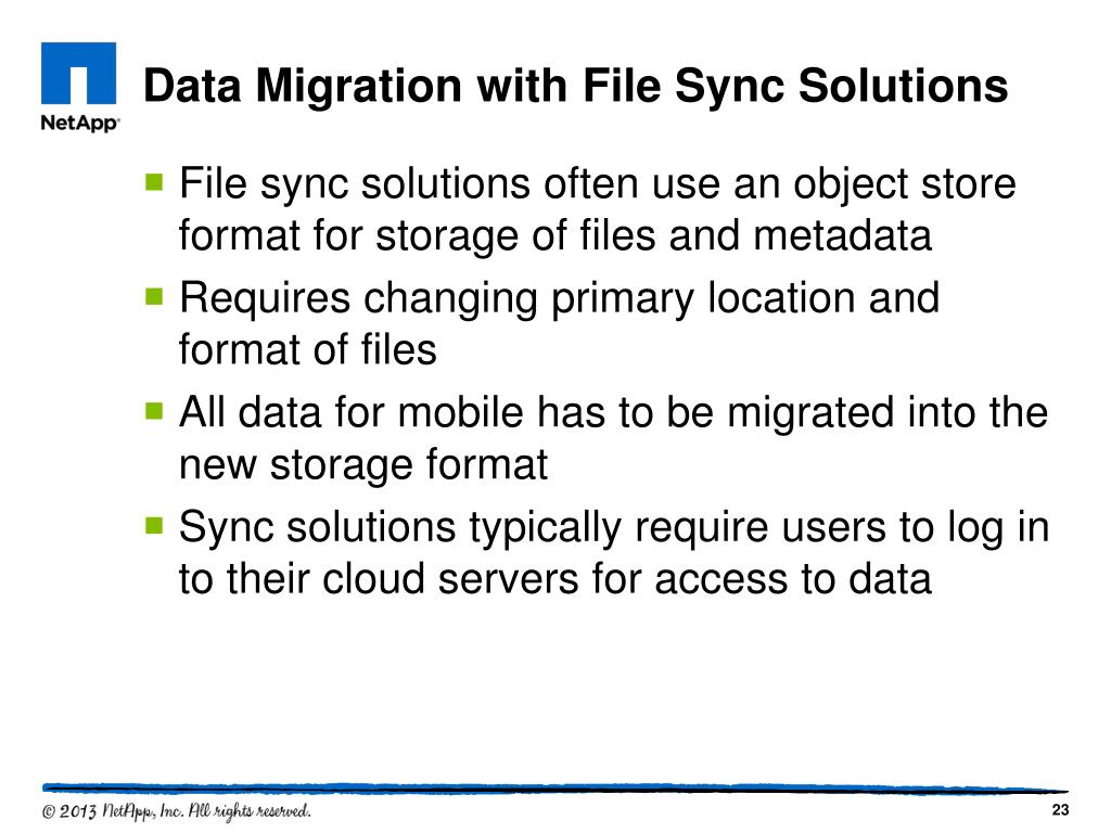 Data Migration with File Sync Solutions • File sync solutions often use an object store format for storage of files and metadata • Requires changing primary location and format of files • All data for mobile has to be migrated into the new storage format • Sync solutions typically require users to log in to their cloud servers for access to data