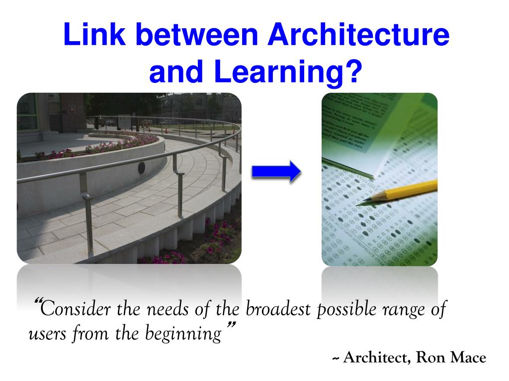Link between Architecture and Learning? • “Consider the needs of the broadest possible range of users from the beginning” • -- Architect, Ron Mace