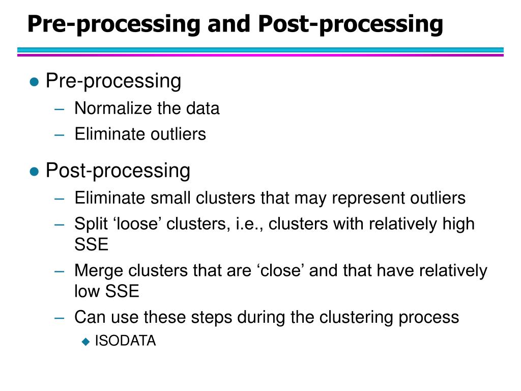 Pre-processing and Post-processing • Pre-processing • Normalize the data • Eliminate outliers • Post-processing • Eliminate small clusters that may represent outliers • Split ‘loose’ clusters, i.e., clusters with relatively high SSE • Merge clusters that are ‘close’ and that have relatively low SSE • Can use these steps during the clustering process • ISODATA