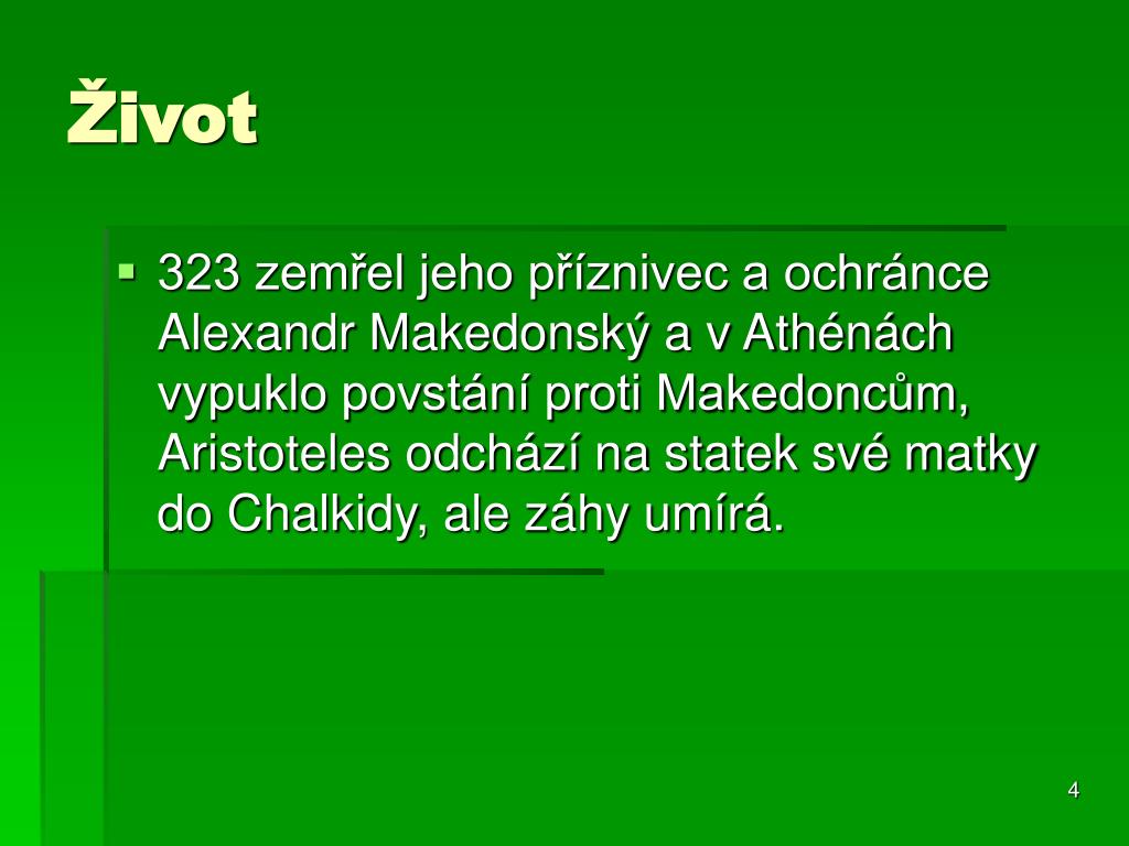 Život • 323 zemřel jeho příznivec a ochránce Alexandr Makedonský a v Athénách vypuklo povstání proti Makedoncům, Aristoteles odchází na statek své matky do Chalkidy, ale záhy umírá.
