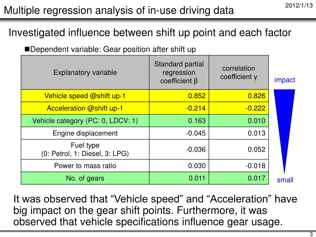 Investigated influence between shift up point and each factor Multiple regression analysis of in-use driving data • Dependent variable: Gear position after shift up impact small It was observed that “Vehicle speed” and “Acceleration” have big impact on the gear shift points. Furthermore, it was observed that vehicle specifications influence gear usage.