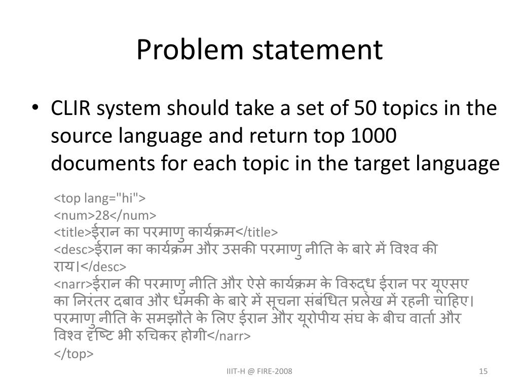 Problem statement • CLIR system should take a set of 50 topics in the source language and return top 1000 documents for each topic in the target language <top lang="hi"> <num>28</num> <title>ईरान का परमाणु कार्यक्रम</title> <desc>ईरान का कार्यक्रम और उसकी परमाणु नीति के बारे में विश्व की राय।</desc> <narr>ईरान की परमाणु नीति और ऐसे कार्यक्रम के विरुद्ध ईरान पर यूएसए का निरंतर दबाव और धमकी के बारे में सूचना संबंधित प्रलेख में रहनी चाहिए। परमाणु नीति के समझौते के लिए ईरान और यूरोपीय संघ के बीच वार्ता और विश्व दृष्टि भी रुचिकर होगी</narr> </top> IIIT-H @ FIRE-2008