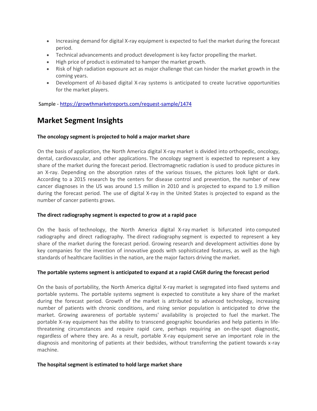 Increasing demand for digital X-ray equipment is expected to fuel the market during the forecast period. Technical advancements and product development is key factor propelling the market. High price of product is estimated to hamper the market growth. Risk of high radiation exposure act as major challenge that can hinder the market growth in the coming years. Development of AI-based digital X-ray systems is anticipated to create lucrative opportunities for the market players. Sample - https://growthmarketreports.com/request-sample/1474 Market Segment Insights The oncology segment is projected to hold a major market share On the basis ofapplication, the North America digital X-raymarket is divided into orthopedic, oncology, dental, cardiovascular, and other applications. The oncology segment is expected to represent a key share of the market during the forecast period. Electromagnetic radiation is used to produce pictures in an X-ray. Depending on the absorption rates of the various tissues, the pictures look light or dark. According to a 2015 research by the centers for disease control and prevention, the number of new cancer diagnoses in the US was around 1.5 million in 2010 and is projected to expand to 1.9 million during the forecast period. The use of digital X-ray in the United States is projected to expand as the number of cancer patients grows. The direct radiography segment is expected to grow at a rapid pace On the basis of technology, the North America digital X-raymarket is bifurcated into computed radiography and direct radiography. The direct radiography segment is expected to represent a key share of the market during the forecast period. Growing research and development activities done by key companies for the invention of innovative goods with sophisticated features, as well as the high standards of healthcare facilities in the nation, are the major factors driving the market. The portable systems segment is anticipated to expand at a rapid CAGR during the forecast period On the basis of portability, the North America digital X-raymarket is segregated into fixed systems and portable systems. The portable systems segment is expected to constitute a key share of the market during the forecast period. Growth of the market is attributed to advanced technology, increasing number of patients with chronic conditions, and rising senior population is anticipated to drive the market. Growing awareness of portable systems' availability is projected to fuel the market. The portable X-ray equipment has the ability to transcend geographic boundaries and help patients in life- threatening circumstances and require rapid care, perhaps requiring an on-the-spot diagnostic, regardless of where they are. As a result, portable X-ray equipment serve an important role in the diagnosis and monitoring of patients at their bedsides, without transferring the patient towards x-ray machine. The hospital segment is estimated to hold large market share