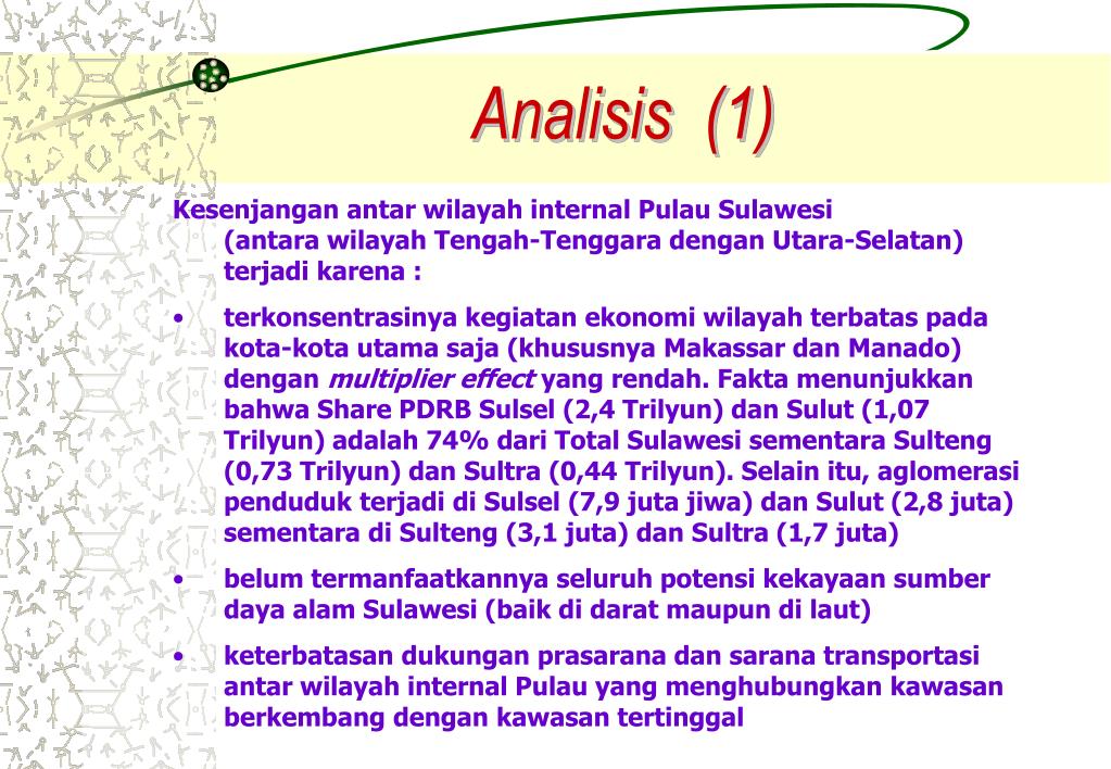 Analisis (1) • Kesenjangan antar wilayah internal Pulau Sulawesi (antara wilayah Tengah-Tenggara dengan Utara-Selatan) terjadi karena : • terkonsentrasinya kegiatan ekonomi wilayah terbatas pada kota-kota utama saja (khususnya Makassar dan Manado) dengan multiplier effect yang rendah. Fakta menunjukkan bahwa Share PDRB Sulsel (2,4 Trilyun) dan Sulut (1,07 Trilyun) adalah 74% dari Total Sulawesi sementara Sulteng (0,73 Trilyun) dan Sultra (0,44 Trilyun). Selain itu, aglomerasi penduduk terjadi di Sulsel (7,9 juta jiwa) dan Sulut (2,8 juta) sementara di Sulteng (3,1 juta) dan Sultra (1,7 juta) • belum termanfaatkannya seluruh potensi kekayaan sumber daya alam Sulawesi (baik di darat maupun di laut) • keterbatasan dukungan prasarana dan sarana transportasi antar wilayah internal Pulau yang menghubungkan kawasan berkembang dengan kawasan tertinggal