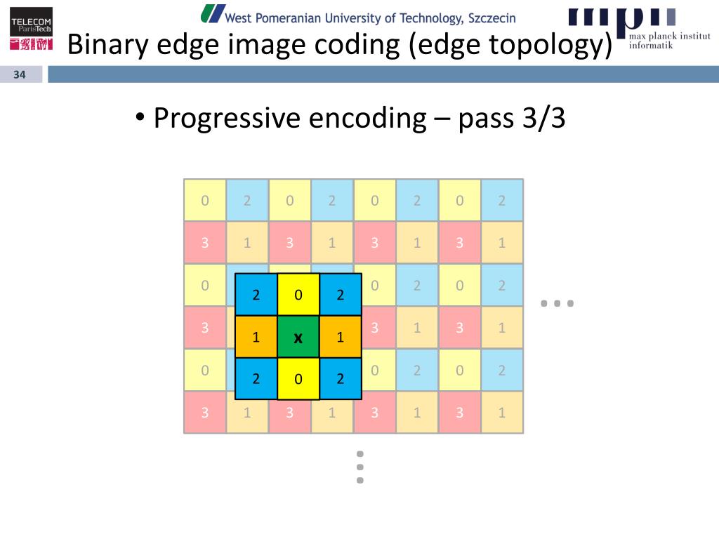 Binary edge image coding (edge topology) • Progressive encoding – pass 2/3 0 2 0 2 0 2 0 2 1 1 1 1 … 0 2 0 2 0 2 0 2 1 1 1 1 2 2 2 0 2 0 2 0 2 0 2 1 1 1 1 1 2 x 0 0 … 1
