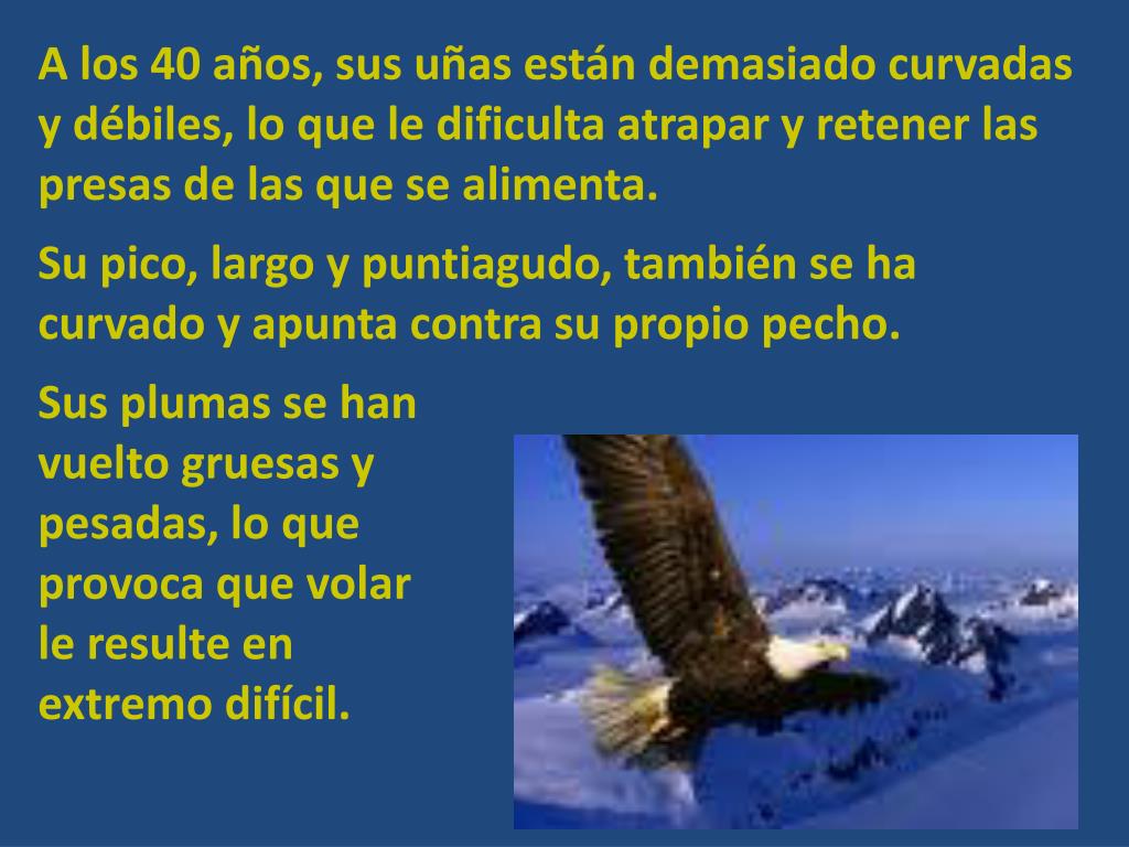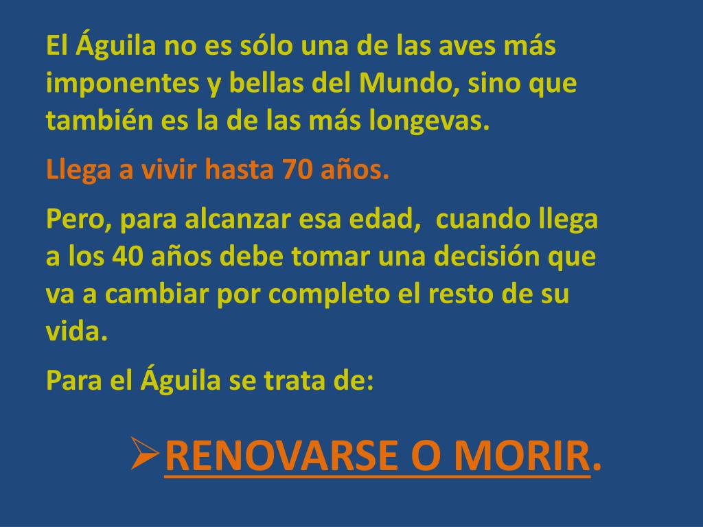 El Águila no es sólo una de las aves más imponentes y bellas del Mundo, sino que también es la de las más longevas. Llega a vivir hasta 70 años. Pero, para alcanzar esa edad, cuando llega a los 40 años debe tomar una decisión que va a cambiar por completo el resto de su vida. Para el Águila se trata de: • RENOVARSE O MORIR.
