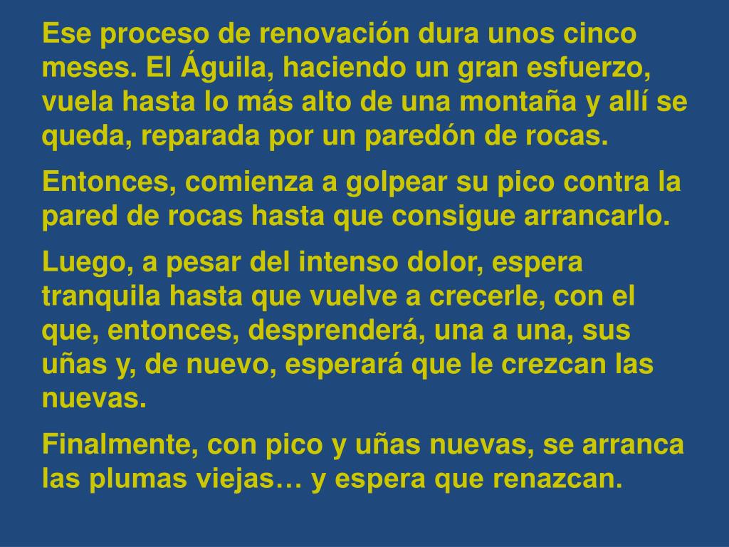 Ese proceso de renovación dura unos cinco meses. El Águila, haciendo un gran esfuerzo, vuela hasta lo más alto de una montaña y allí se queda, reparada por un paredón de rocas. Entonces, comienza a golpear su pico contra la pared de rocas hasta que consigue arrancarlo. Luego, a pesar del intenso dolor, espera tranquila hasta que vuelve a crecerle, con el que, entonces, desprenderá, una a una, sus uñas y, de nuevo, esperará que le crezcan las nuevas. Finalmente, con pico y uñas nuevas, se arranca las plumas viejas… y espera que renazcan.