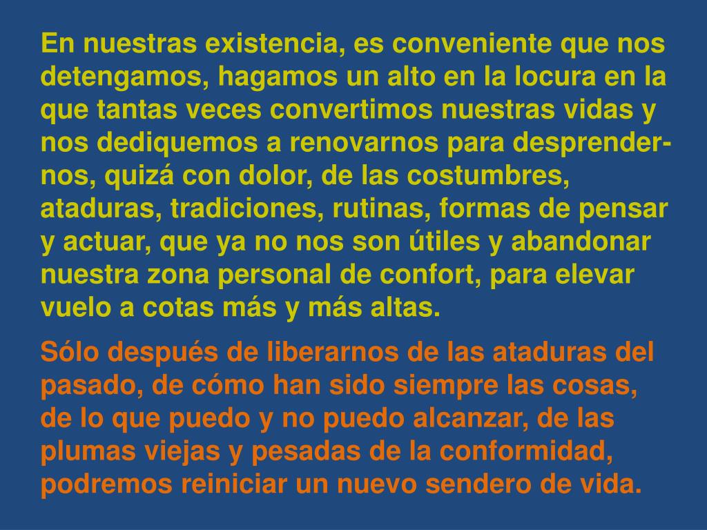 En nuestras existencia, es conveniente que nos detengamos, hagamos un alto en la locura en la que tantas veces convertimos nuestras vidas y nos dediquemos a renovarnos para desprender-nos, quizá con dolor, de las costumbres, ataduras, tradiciones, rutinas, formas de pensar y actuar, que ya no nos son útiles y abandonar nuestra zona personal de confort, para elevar vuelo a cotas más y más altas. Sólo después de liberarnos de las ataduras del pasado, de cómo han sido siempre las cosas, de lo que puedo y no puedo alcanzar, de las plumas viejas y pesadas de la conformidad, podremos reiniciar un nuevo sendero de vida.