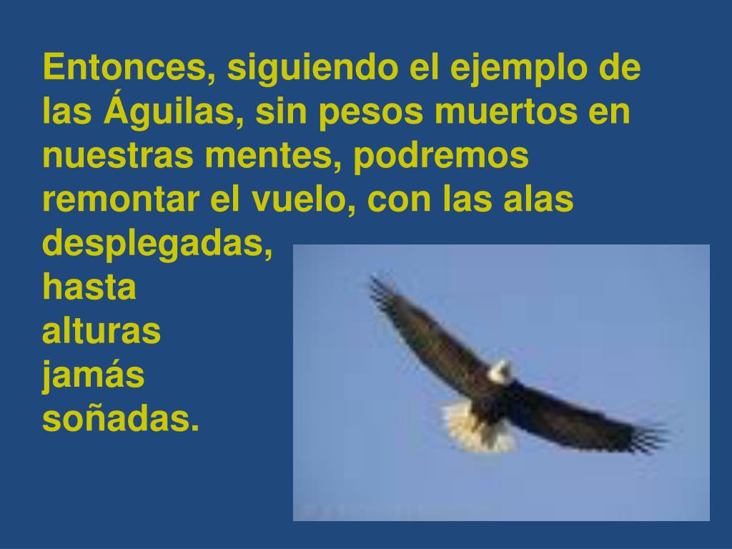 Entonces, siguiendo el ejemplo de las Águilas, sin pesos muertos en nuestras mentes, podremos remontar el vuelo, con las alas desplegadas, hasta alturas jamás soñadas.