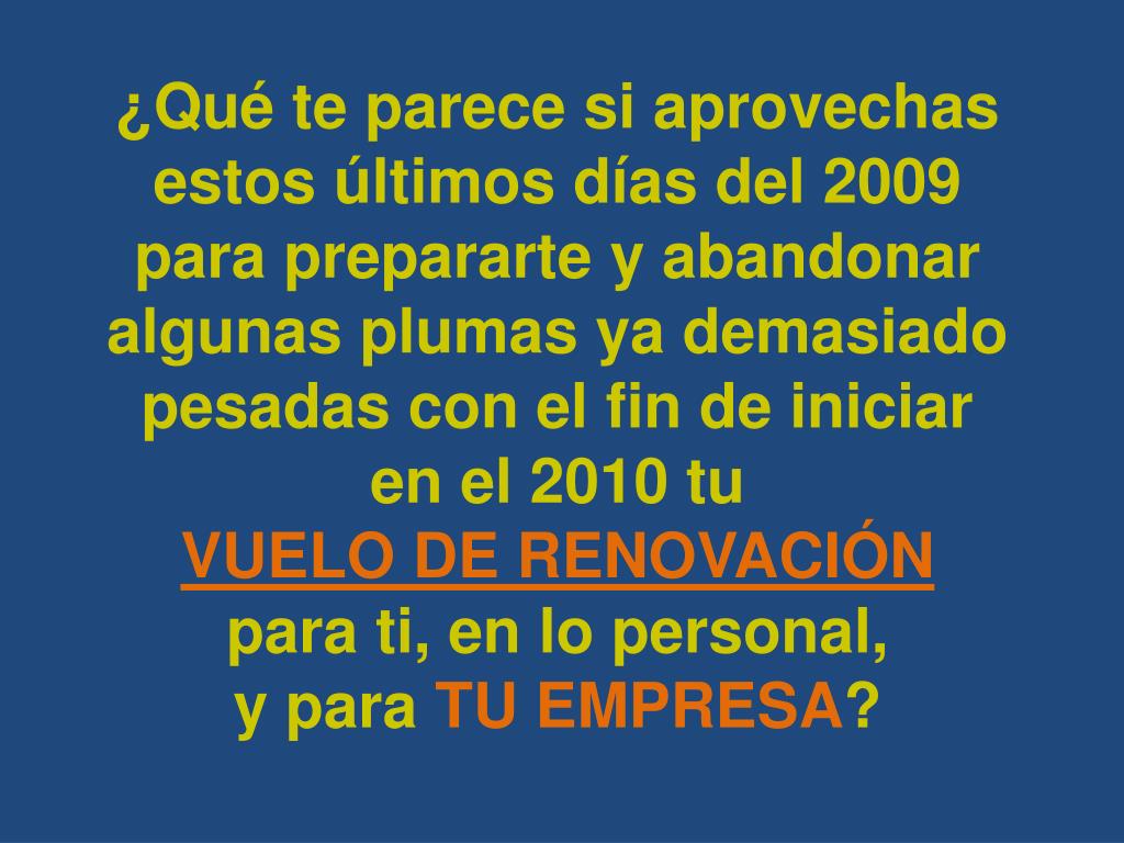 ¿Qué te parece si aprovechas estos últimos días del 2009 para prepararte y abandonar algunas plumas ya demasiado pesadas con el fin de iniciar en el 2010 tu VUELO DE RENOVACIÓN para ti, en lo personal, y para TU EMPRESA?