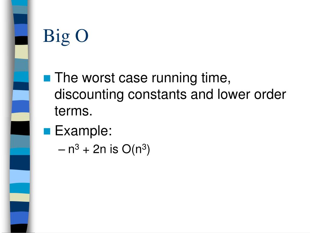 Big O • The worst case running time, discounting constants and lower order terms. • Example: • n3 + 2n is O(n3)