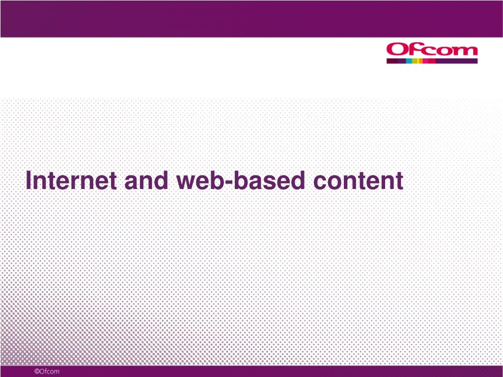 Broadband – take-up Broadband take-up across the UK’s nations Take up (% of homes) QE9. Which of these methods does your household use to connect to the internet at home? Source: Ofcom research, Quarter 1 2011 Base: All adults aged 15+ (n = 3474 UK, 493 Wales, 1983 England, 487 Scotland, 511 Northern Ireland)