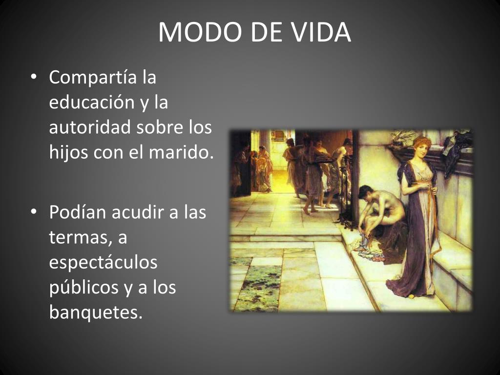 MODO DE VIDA • Compartía la educación y la autoridad sobre los hijos con el marido. • Podían acudir a las termas, a espectáculos públicos y a los banquetes.