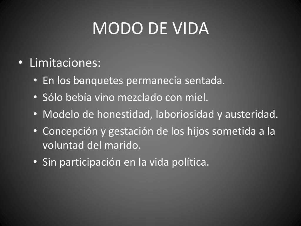 MODO DE VIDA • Limitaciones: • En los banquetes permanecía sentada. • Sólo bebía vino mezclado con miel. • Modelo de honestidad, laboriosidad y austeridad. • Concepción y gestación de los hijos sometida a la voluntad del marido. • Sin participación en la vida política. • .