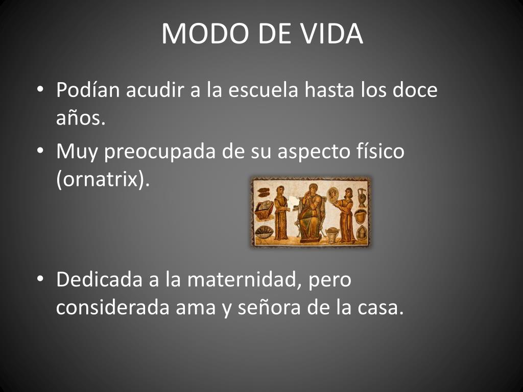 MODO DE VIDA • Podían acudir a la escuela hasta los doce años. • Muy preocupada de su aspecto físico (ornatrix). • Dedicada a la maternidad, pero considerada ama y señora de la casa.