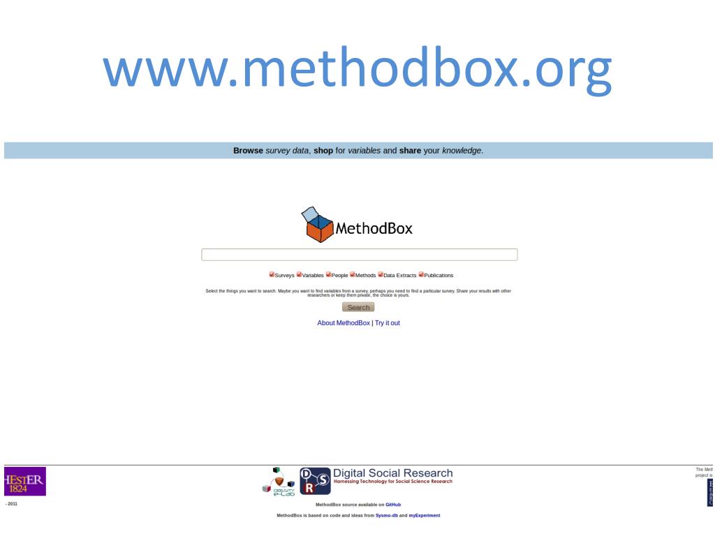 Where we are upto • MethodBox launched at an ESDS government event April 2010 (5.7/7 from 15 responses) • 69 surveys available (e.g. HSE) • 259 datasets (e.g. HSE 2008) • 176 data extracts • 51 scripts • 400 unique visits in the last month (up 25%)