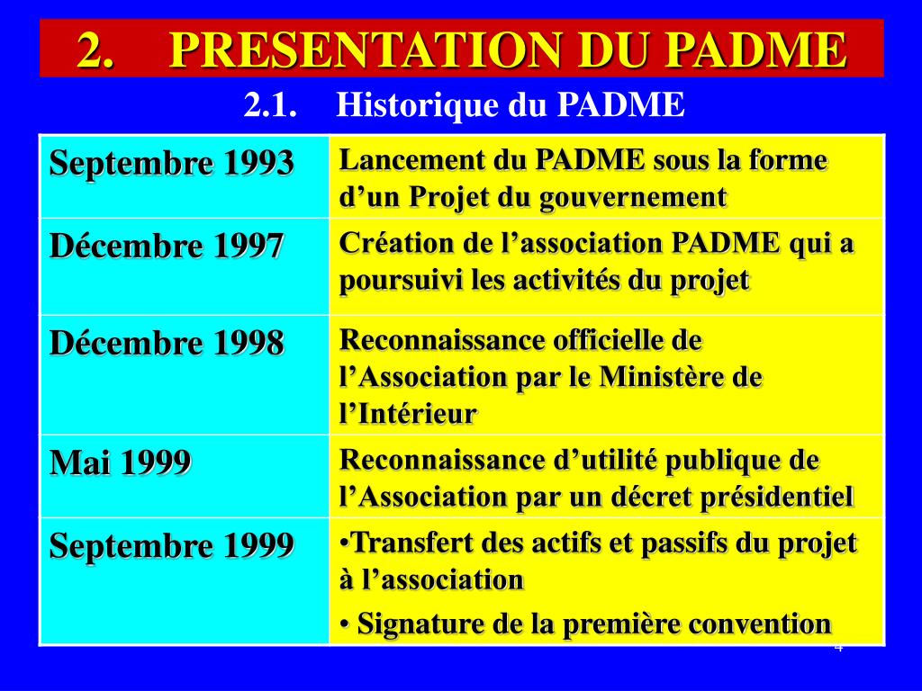 2. PRESENTATION DU PADME 2.1. Historique du PADME