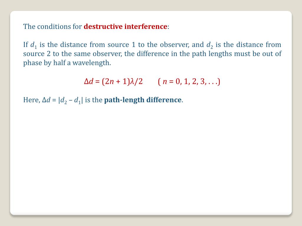 The conditions for destructive interference: If d1 is the distance from source 1 to the observer, and d2 is the distance from source 2 to the same observer, the difference in the path lengths must be out of phase by half a wavelength. Δd = (2n + 1)λ/2( n = 0, 1, 2, 3, . . .) Here, Δd= |d2 – d1| is the path-length difference.