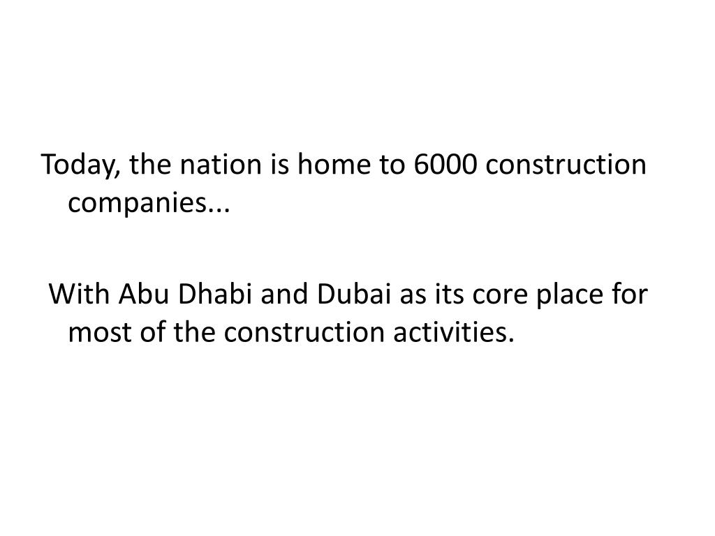 Today, the nation is home to 6000 construction companies... With Abu Dhabi and Dubai as its core place for most of the construction activities.
