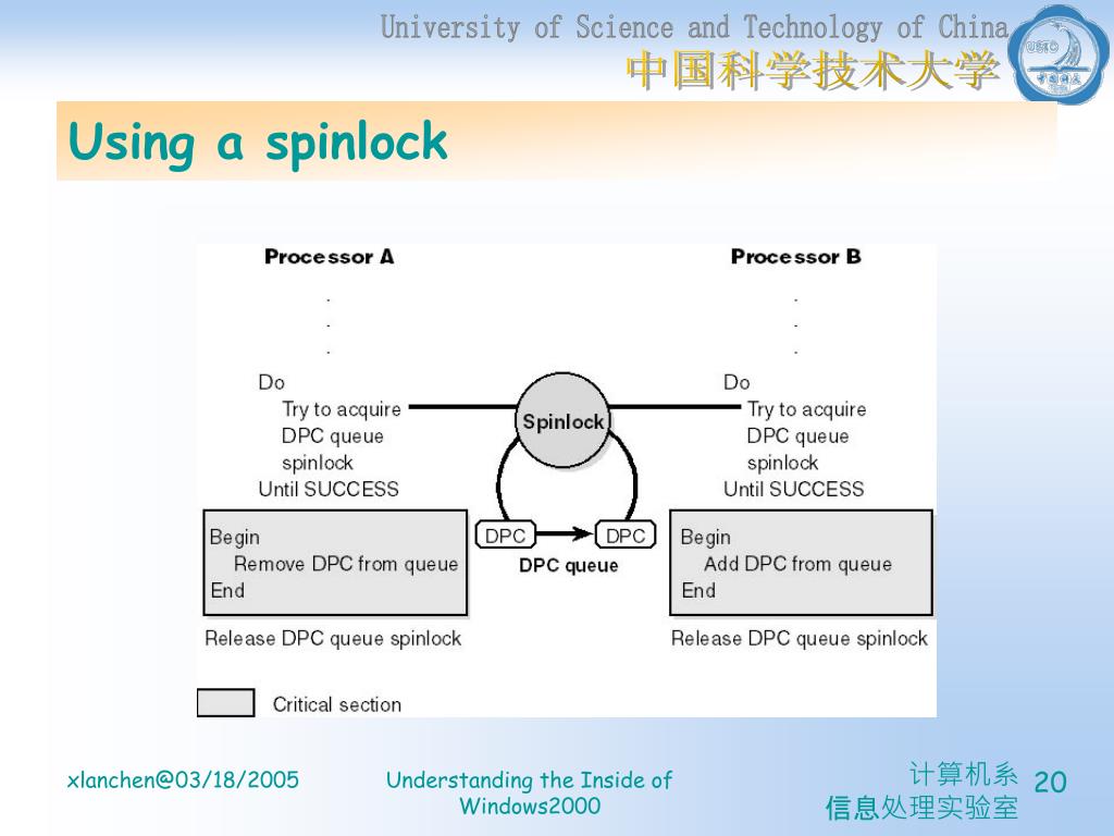 Kernel Synchronization • Kernel critical sections • For single-processor • Simple operating systems: disable all interrupts • 2K: raising the processor's IRQL • For a multiprocessor • spinlock Understanding the Inside of Windows2000