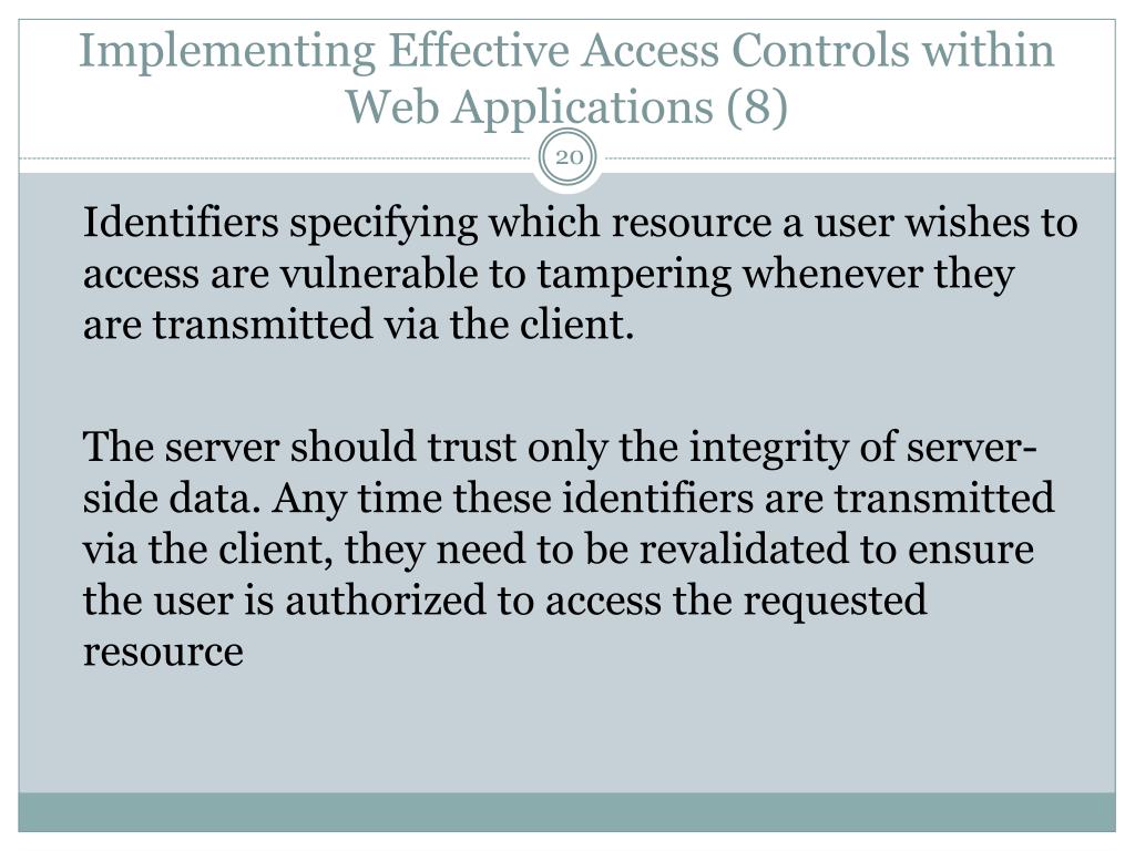 ImplementingEffective Access Controls within Web Applications (8) Identifiersspecifyingwhich resource a user wishes to access are vulnerable to tamperingwheneverthey are transmitted via the client. The server should trust only the integrity of server-side data. Any time these identifiers are transmitted via the client, theyneed to berevalidated to ensure the user is authorized to access the requested resource