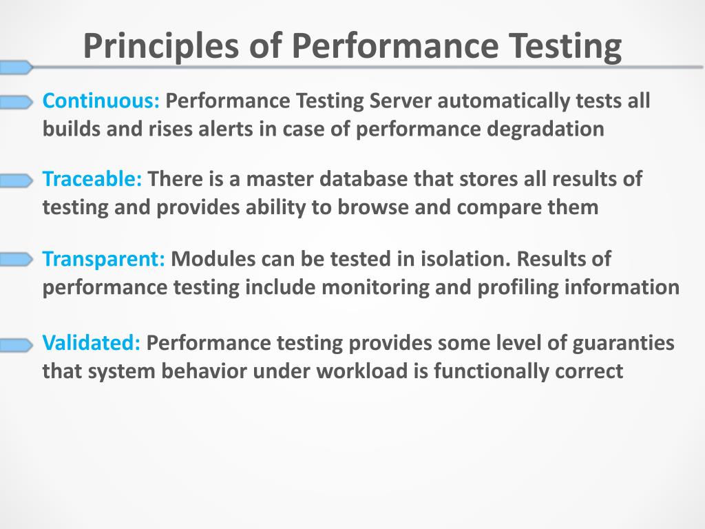 Principles of Performance Testing Continuous: Performance Testing Server automatically tests all builds and rises alerts in case of performance degradation Traceable: There is a master database that stores all results of testing and provides ability to browse and compare them Transparent: Modules can be tested in isolation. Results of performance testing include monitoring and profiling information Validated: Performance testing provides some level of guaranties that system behavior under workload is functionally correct