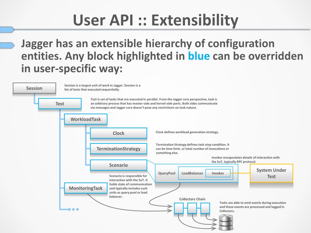 User API :: Extensibility Jagger has an extensible hierarchy of configuration entities. Any block highlighted in blue can be overridden in user-specific way: Session is a largest unit of work in Jagger. Session is a list of tests that executed sequentially. Session Test is set of tasks that are executed in parallel. From the Jagger core perspective, task is an arbitrary process that has master-side and kernel-side parts. Both sides communicate via messages and Jagger core doesn’t pose any restrictions on task nature. Test WorkloadTask Clock Clock defines workload generation strategy. Termination Strategy defines task stop condition. It can be time limit, or total number of invocations or something else. TerminationStrategy Invoker encapsulates details of interaction with the SuT, typically RPC protocol. Scenario QueryPool System Under Test LoadBalancer Invoker Scenario is responsible for interaction with the SuT. It holds state of communication and typically includes such units as query pool or load balancer. MonitoringTask Collectors Chain Tasks are able to emit events during execution and these events are processed and logged in Collectors.