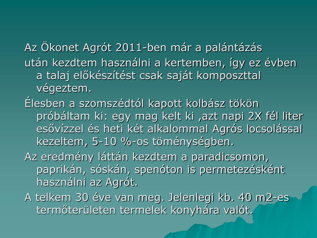 Az Ökonet Agrót 2011-ben már a palántázás után kezdtem használni a kertemben, így ez évben a talaj előkészítést csak saját komposzttal végeztem. Élesben a szomszédtól kapott kolbász tökön próbáltam ki: egy mag kelt ki ,azt napi 2X fél liter esővízzel és heti két alkalommal Agrós locsolással kezeltem, 5-10 %-os töménységben. Az eredmény láttán kezdtem a paradicsomon, paprikán, sóskán, spenóton is permetezésként használni az Agrót. A telkem 30 éve van meg. Jelenlegi kb. 40 m2-es termőterületen termelek konyhára valót.