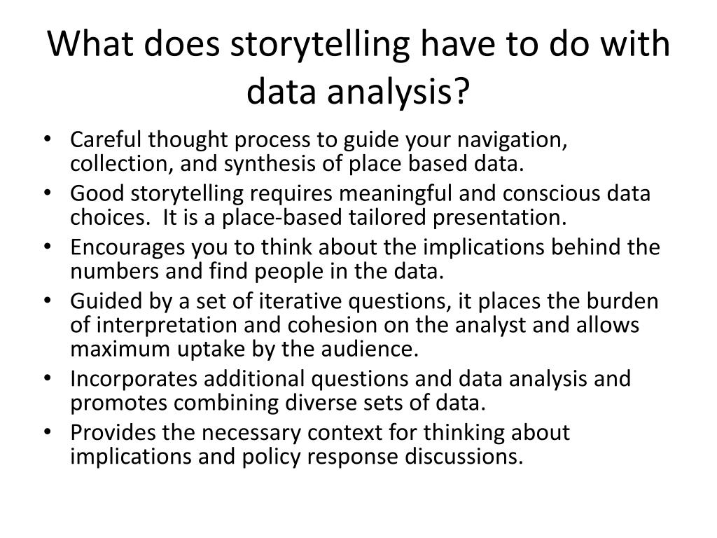 What does storytelling have to do with data analysis? • Careful thought process to guide your navigation, collection, and synthesis of place based data. • Good storytelling requires meaningful and conscious data choices. It is a place-based tailored presentation. • Encourages you to think about the implications behind the numbers and find people in the data. • Guided by a set of iterative questions, it places the burden of interpretation and cohesion on the analyst and allows maximum uptake by the audience. • Incorporates additional questions and data analysis and promotes combining diverse sets of data. • Provides the necessary context for thinking about implications and policy response discussions.