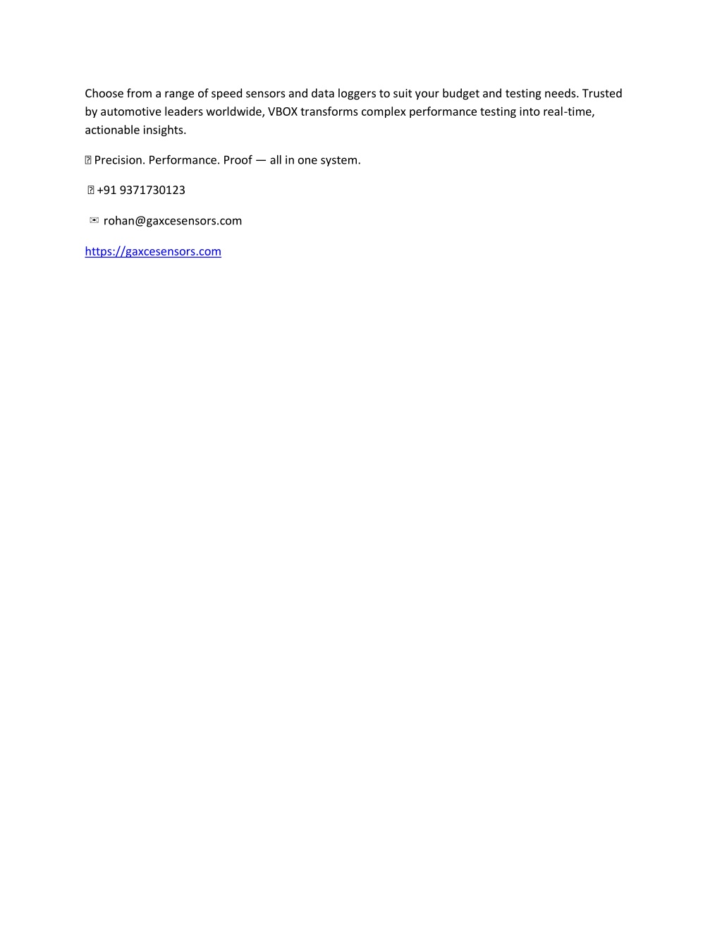2. Choose from a range of speed sensors and data loggers to suit your budget and testing needs. Trusted by automotive leaders worldwide, VBOX transforms complex performance testing into real-time, actionable insights. ? Precision. Performance. Proof — all in one system. ? +91 9371730123 ✉ rohan@gaxcesensors.com https://gaxcesensors.com