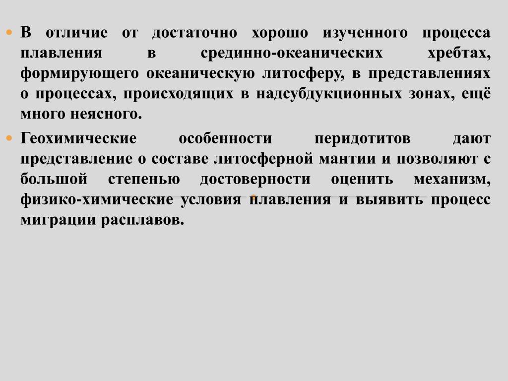 В отличие от достаточно хорошо изученного процесса плавления в срединно-океанических хребтах, формирующего океаническую литосферу, в представлениях о процессах, происходящих в надсубдукционных зонах, ещё много неясного. • Геохимические особенности перидотитов дают представление о составе литосферной мантии и позволяют с большой степенью достоверности оценить механизм, физико-химические условия плавления и выявить процесс миграции расплавов.