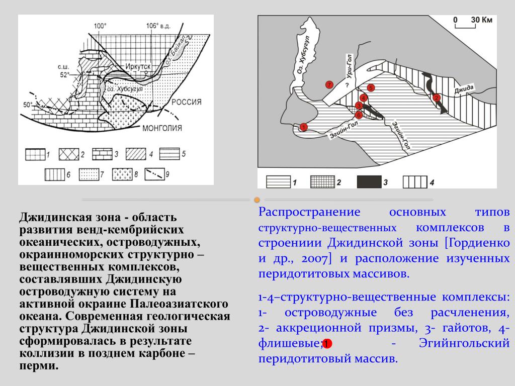 Распространение основных типов структурно-вещественных комплексов в строениии Джидинской зоны [Гордиенко и др., 2007] и расположение изученных перидотитовых массивов. 1-4–структурно-вещественные комплексы: 1- островодужные без расчленения,2- аккреционной призмы, 3- гайотов, 4- флишевые; - Эгийнгольский перидотитовый массив. Джидинская зона - область развития венд-кембрийских океанических, островодужных, окраинноморских структурно – вещественных комплексов, составлявших Джидинскую островодужную систему на активной окраине Палеоазиатского океана. Современная геологическая структура Джидинской зоны сформировалась в результате коллизии в позднем карбоне – перми. 1