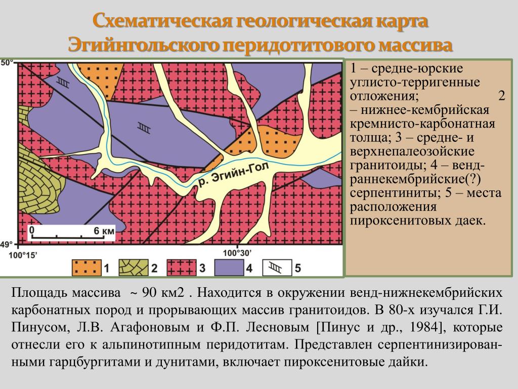 Схематическая геологическая карта Эгийнгольского перидотитового массива 1– средне-юрские углисто-терригенные отложения; 2 – нижнее-кембрийская кремнисто-карбонатная толща; 3 – средне- и верхнепалеозойские гранитоиды; 4 – венд-раннекембрийские(?) серпентиниты; 5 – места расположения пироксенитовых даек. Площадь массива ~ 90 км2 . Находится в окружении венд-нижнекембрийских карбонатных пород и прорывающих массив гранитоидов. В 80-х изучался Г.И. Пинусом, Л.В. Агафоновым и Ф.П. Лесновым [Пинус и др., 1984], которые отнесли его к альпинотипным перидотитам. Представлен серпентинизирован-ными гарцбургитами и дунитами, включает пироксенитовые дайки.