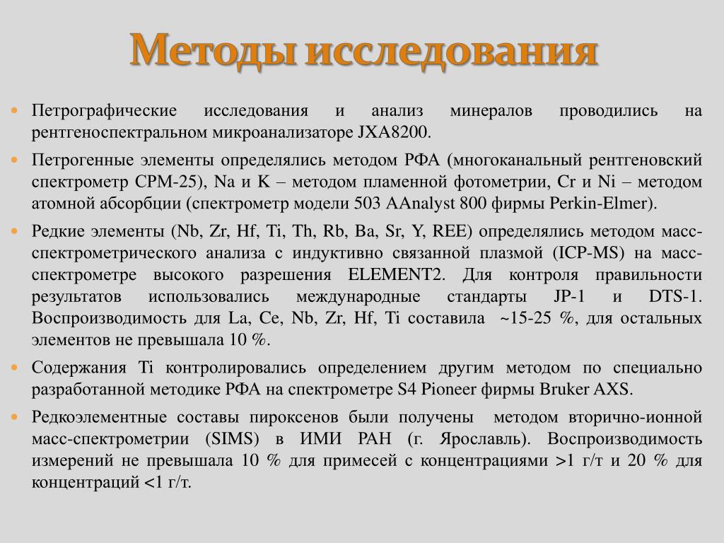 Петрографические исследования и анализ минералов проводились на рентгеноспектральном микроанализаторе JXA8200. • Петрогенные элементы определялись методом РФА (многоканальный рентгеновский спектрометр СРМ-25), Na и K – методом пламенной фотометрии, Cr и Ni – методом атомной абсорбции (спектрометр модели 503 АAnalyst 800 фирмы Perkin-Elmer). • Редкие элементы (Nb, Zr, Hf, Ti, Th, Rb, Ba, Sr, Y, REE) определялись методом масс-спектрометрического анализа с индуктивно связанной плазмой (ICP-MS) на масс-спектрометре высокого разрешения ELEMENT2. Для контроля правильности результатов использовались международные стандарты JP-1 и DTS-1. Воспроизводимость для La, Ce, Nb, Zr, Hf, Ti составила ~15-25 %, для остальных элементов не превышала 10 %. • Содержания Ti контролировались определением другим методом по специально разработанной методике РФА на спектрометре S4 Pioneer фирмы Bruker AXS. • Редкоэлементные составы пироксенов были получены методом вторично-ионной масс-спектрометрии (SIMS) в ИМИ РАН (г. Ярославль). Воспроизводимость измерений не превышала 10 % для примесей с концентрациями >1 г/т и 20 % для концентраций <1 г/т.
