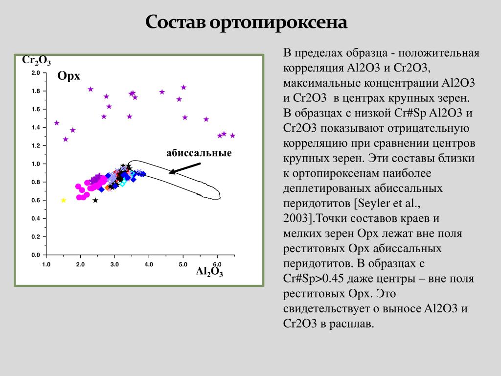 Opx абиссальные Состав ортопироксена Cr2O3 В пределах образца- положительная корреляция Al2O3 и Cr2O3, максимальные концентрацииAl2O3 и Cr2O3 в центрах крупных зерен. В образцах с низкой Сr#Sp Al2O3 и Cr2O3 показывают отрицательную корреляцию при сравнении центров крупных зерен. Эти составы близки к ортопироксенам наиболее деплетированых абиссальных перидотитов [Seyler et al., 2003].Точки составов краев и мелких зерен Opx лежат вне поля реститовых Opx абиссальных перидотитов. В образцах с Cr#Sp>0.45 даже центры – вне поля реститовых Opx. Это свидетельствует о выносе Al2O3 и Cr2O3 в расплав. Al2O3