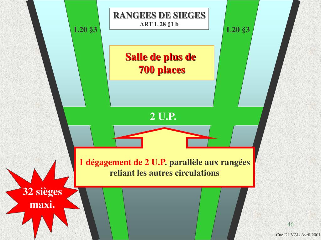 RANGEES DE SIEGES ART L 28 §1 b Salle de plus de 1500 places L20 §3 L20 §3 700 places 2 U.P. 700 places 32 sièges maxi. 2 U.P. 700 places 2UP mini 2UP mini Cne DUVAL Avril 2001