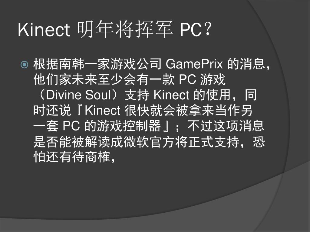 Kinect明年将挥军 PC? • 根据南韩一家游戏公司 GamePrix的消息,他们家未来至少会有一款 PC 游戏(Divine Soul)支持 Kinect的使用,同时还说『Kinect很快就会被拿来当作另一套 PC 的游戏控制器』;不过这项消息是否能被解读成微软官方将正式支持,恐怕还有待商榷,