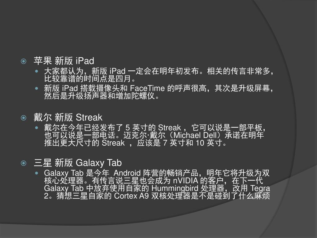 苹果 新版 iPad • 大家都认为,新版 iPad一定会在明年初发布。相关的传言非常多,比较靠谱的时间点是四月。 • 新版 iPad搭载摄像头和 FaceTime的呼声很高,其次是升级屏幕,然后是升级扬声器和增加陀螺仪。 • 戴尔 新版 Streak • 戴尔在今年已经发布了 5 英寸的 Streak ,它可以说是一部平板,也可以说是一部电话。迈克尔·戴尔(Michael Dell)承诺在明年推出更大尺寸的 Streak ,应该是 7 英寸和 10 英寸。 • 三星 新版 Galaxy Tab • Galaxy Tab 是今年 Android 阵营的畅销产品,明年它将升级为双核心处理器。有传言说三星也会成为 nVIDIA的客户,在下一代 Galaxy Tab 中放弃使用自家的 Hummingbird 处理器,改用 Tegra 2。猜想三星自家的 Cortex A9 双核处理器是不是碰到了什么麻烦