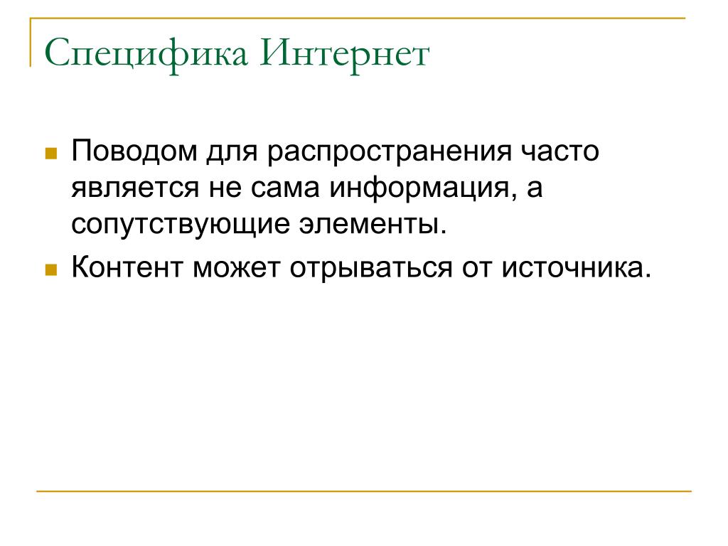Специфика Интернет • Поводом для распространения часто является не сама информация, а сопутствующие элементы. • Контент может отрываться от источника.