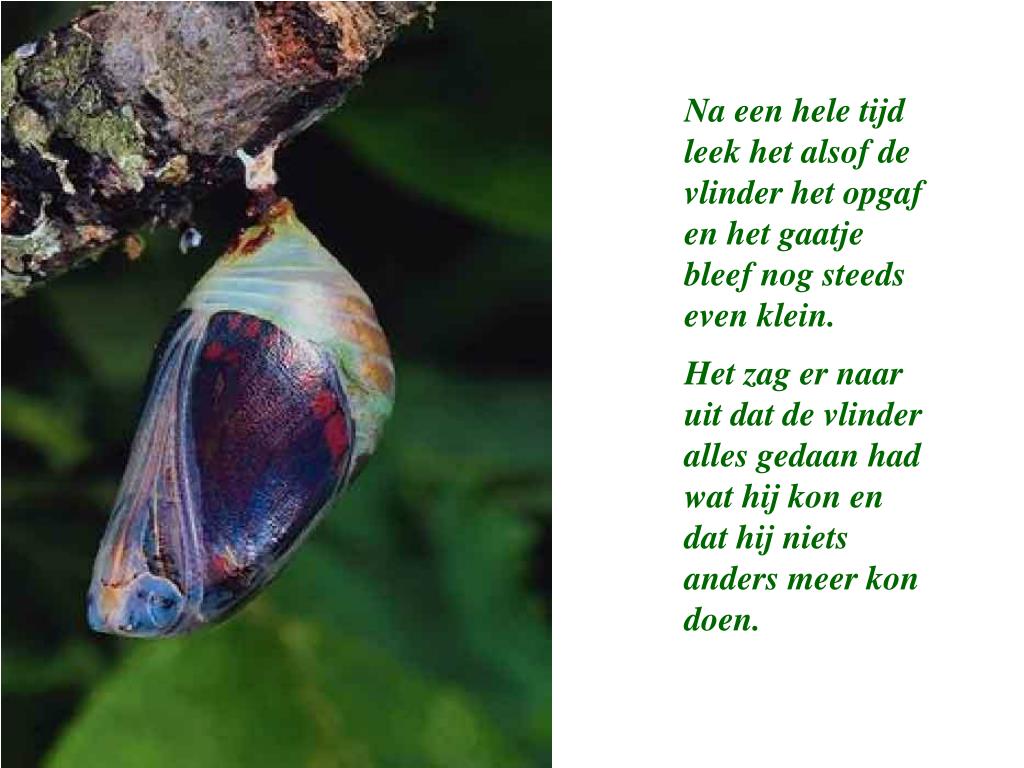 Na een hele tijd leek het alsof de vlinder het opgaf en het gaatje bleef nog steeds even klein. Het zag er naar uit dat de vlinder alles gedaan had wat hij kon en dat hij niets anders meer kon doen.