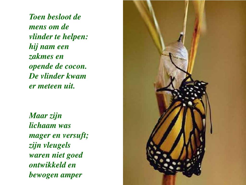 De les van de vlinder. “Op een dag ontstond er een klein gaatje in een cocon. Een mens, die toevallig voorbij kwam, stopte en observeerde urenlang de vlinder die uit alle macht probeerde door dit kleine gaatje te kruipen.