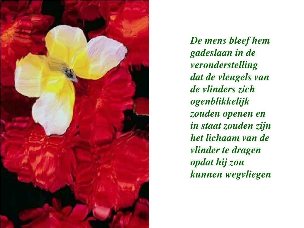 De mens bleef hem gadeslaan in de veronderstelling dat de vleugels van de vlinders zich ogenblikkelijk zouden openen en in staat zouden zijn het lichaam van de vlinder te dragen opdat hij zou kunnen wegvliegen