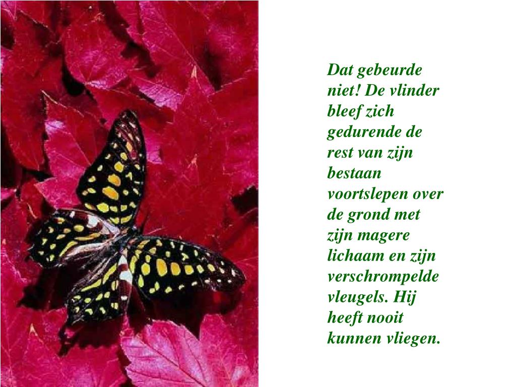 Dat gebeurde niet! De vlinder bleef zich gedurende de rest van zijn bestaan voortslepen over de grond met zijn magere lichaam en zijn verschrompelde vleugels. Hij heeft nooit kunnen vliegen.